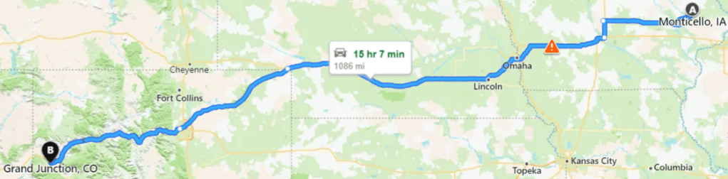 We left on Saturday afternoon, after Brandon got off from a full day of work. I had already packed the car, taken the Furries to the Veterinarian’s office to be kenneled and made reservations for our first 2 nights of travel. The first night was in Lincoln, NE, the second was to be in Grand Junction, CO. Both reservations were at Motel 6, as we thought that Gracie would be traveling with us. Look for a blog about motels and hotels along the way. Our first night was difficult finding a room in Lincoln, after we cancelled our booking at the M6 from the lobby. We found an available room at the Holiday Inn Express and turned in, resting up for the next day of travel.