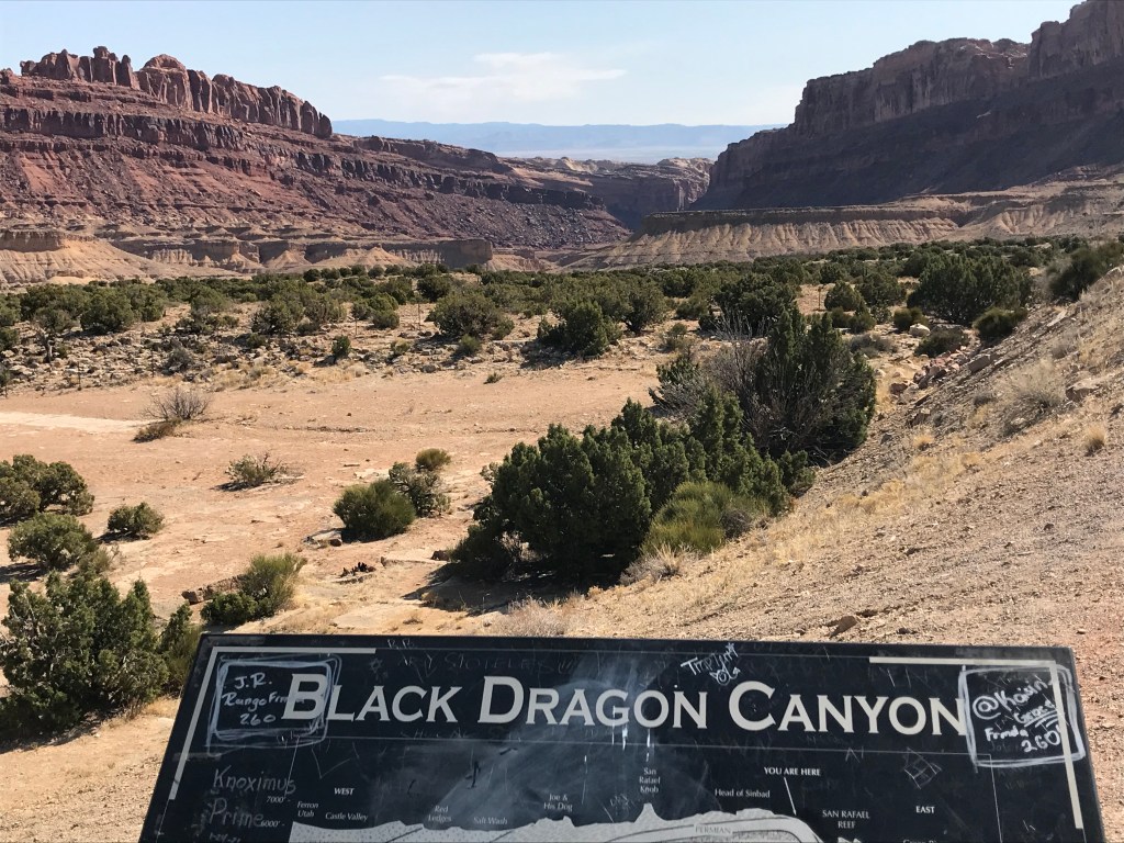 One of Brandon’s coworkers had mentioned Black Dragon Canyon to him, so it was on his list to see. The panoramic at the top of this post is of the Black Dragon Canyon scenic overlook. The overlook was just a few miles from Green River, on the interstate, as we pulled off to park we noticed a young Native American woman with trinkets spread on a blanket and a few stand up pieces displaying necklaces and such. There was also a trail just past the information sign, Brandon parked and got out of the car by himself. The terrain was more than I could handle with my current physical restraints, so he went off to investigate by himself.