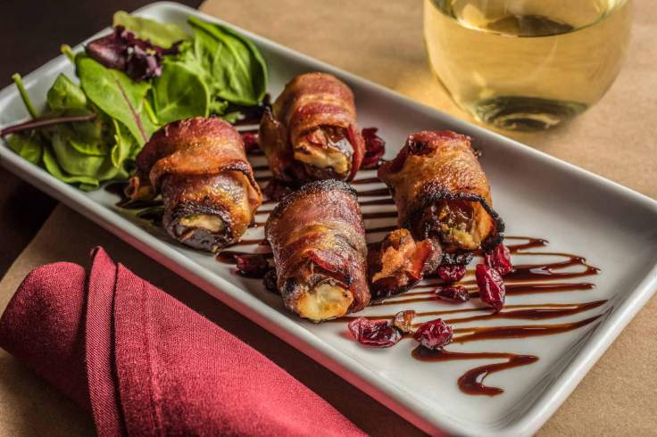 Crazy Dates consist of goat cheese stuffed dates, wrapped in bacon and then drizzled with a balsamic reduction before serving.
